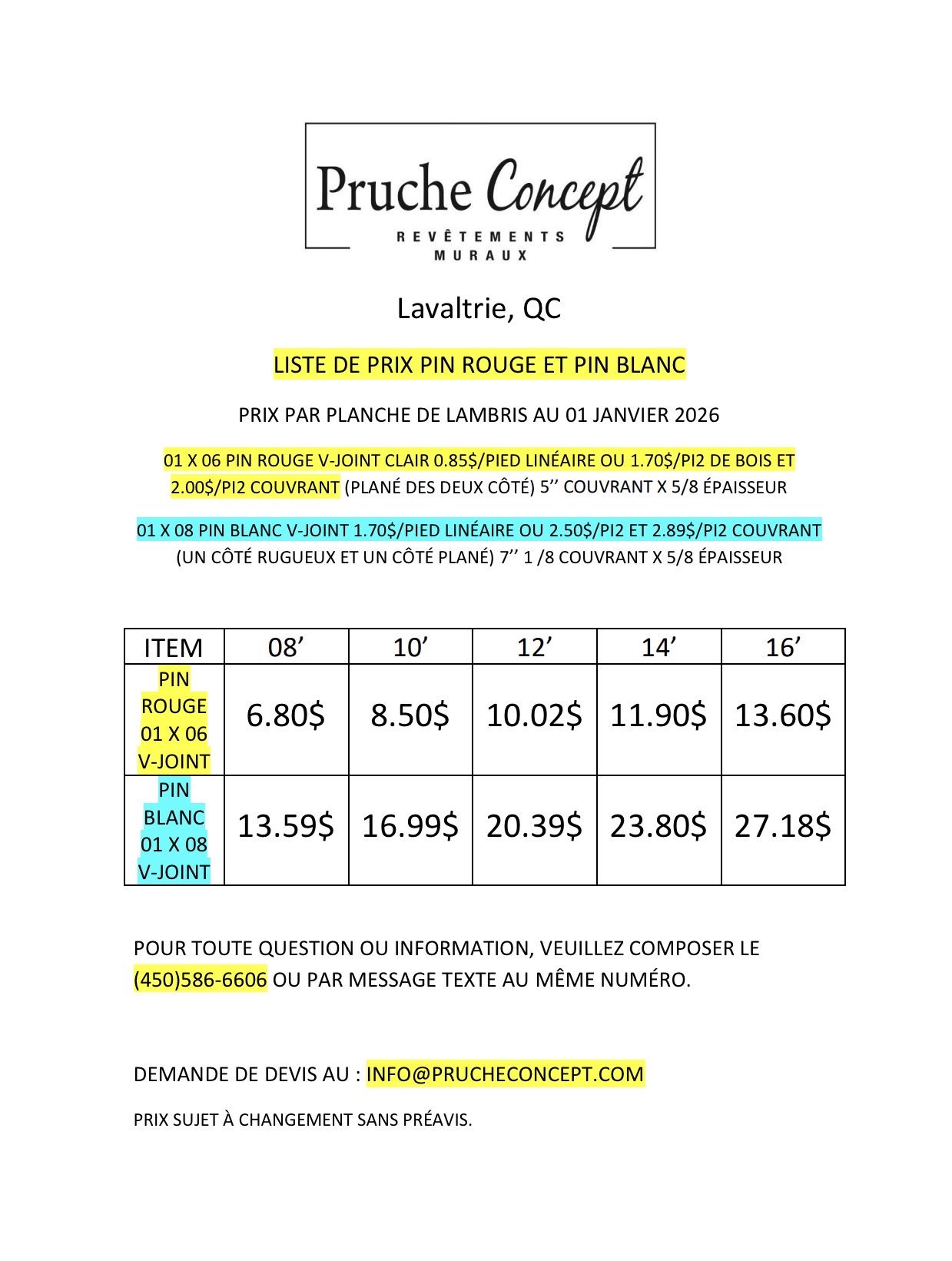 Liste de prix pin rouge et pin blanc